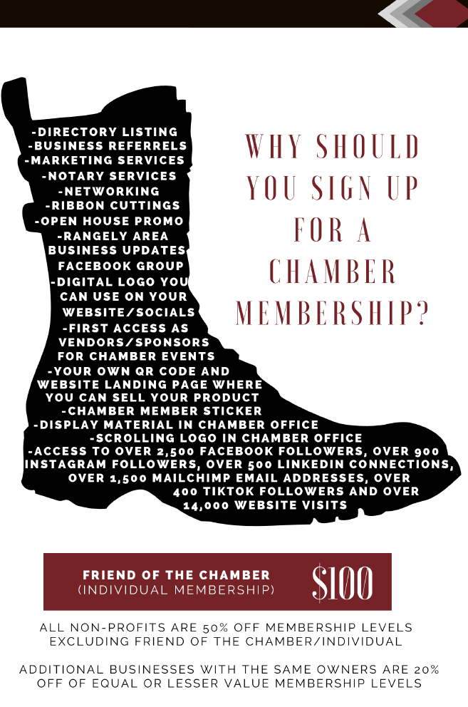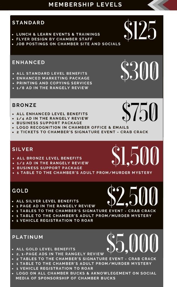 All Silver level benefits plus a full page Ad in the Rangely Review, 1 Table to the Chamber's Signature Event-Crab Crack, 1 Table to the Chamber's Adult Prom/Murder Mystery Event and 1 Vehicle Registration to ROAR.