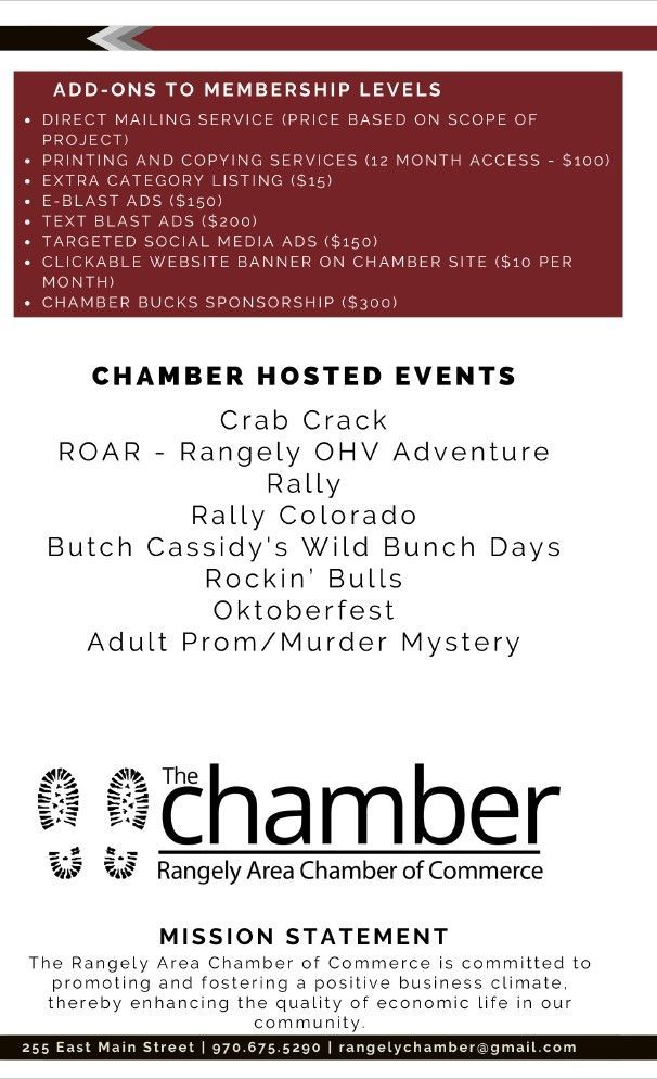 All benefits plus 2 full page Ads in the Rangely Review, 2 Tables to the Chamber's Signature Event-Crab Crack, 1 Table to the Chamber's Adult Prom/Murder Mystery Event, 1 Vehicle Registration to ROAR, 10 Tickets-Rockin' Bulls, 10 Tickets-Butch Cassidy's Rodeo.
